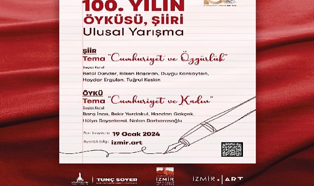 İzmir Büyükşehir Belediyesi’nin Cumhuriyet’in 100’üncü yıl dönümü kapsamında düzenlediği “100. Yılın Öyküsü, Şiiri” adlı ulusal öykü ve şiir yarışmasına başvurular devam ediyor. Son katılım tarihi 19 Ocak 2024 olan yarışma şiir kategorisinde “Cumhuriyet ve Özgürlük”, öykü kategorisinde ise “Cumhuriyet ve Kadın” temalarıyla düzenleniyor. Cumhuriyet’in kurucu kuşağının çağdaş ve aydınlık mirasını ana odağına alan ulusal katılımlı yarışma, yüz yıllık tarihi birikimin toplumsal ve kültürel izdüşümüne mercek tutmayı hedefliyor.
