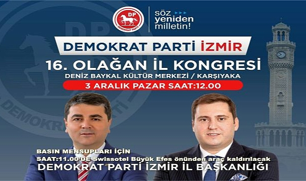 Demokrat Parti'nin (DP) kalbi hafta sonunda İzmir’de atacak. hafta sonunda DP İzmir 16. İl Kongresi 3 Aralık 2023 Pazar günü şölen havasında gerçekleşecek. Karşıyaka’daki Deniz Baykal Kültür Merkezi’ndeki kongrenin başlama saati 12.00.