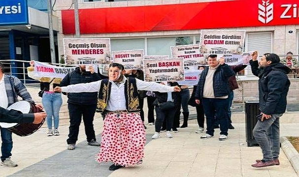 İş insanı Yakup Toprak ve arkadaşları Menderes Belediye Başkan Vekili Erkan Özkan’ın ruhsat karşılığı 250 bin dolar rüşvet istemesini protesto etmek için ellerinde pankartlarla belediye binası önüne geldiler. 'Geçmiş olsun Menderes”, “Seni başkan yaptırmadık”, “Rüşvet yedim kaçtım”, “Kutu kutu pense başkan rüşvet yerse”, “Geldim, gördüm, çaldım, gittim" yazılı pankartlarla rüşvet olayına tepki gösterirlerken, Mendereslilerin dikkatini çekmek için Erkan Özkan'ın fotoğrafının basıldığı maskeyi takan biri de zenne kıyafeti ile oynadı.