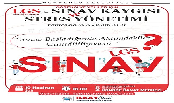 Menderes Belediyesi, velilerin ve öğrencilerin sınav kaygısı ile mücadele etme ve stresi yönetmesi adına eğitim düzenleyecek. Menderes Belediyesi bünyesinde yer alan Psikolog Almina Kahraman’ın vereceği eğitim ile vatandaşların bu süreci kolay atlatması sağlanacak. Lise Giriş Sınavı (LGS) ve Yüksek Öğretim Kurumları (YKS) sınavlarına girecek olanlar için yapılacak eğitimler Menderes Belediyesi Nikah Sarayı, Kongre ve Sanat Merkezi’nde gerçekleşecek. LGS etkinliğinin 10 Haziran Salı günü saat 18:00’da, YKS etkinliğinin ise 19 Haziran Perşembe günü saat 18:00’da yapılacağı duyuruldu. Tüm vatandaşların ücretsiz olarak katılabileceği belirtildi.